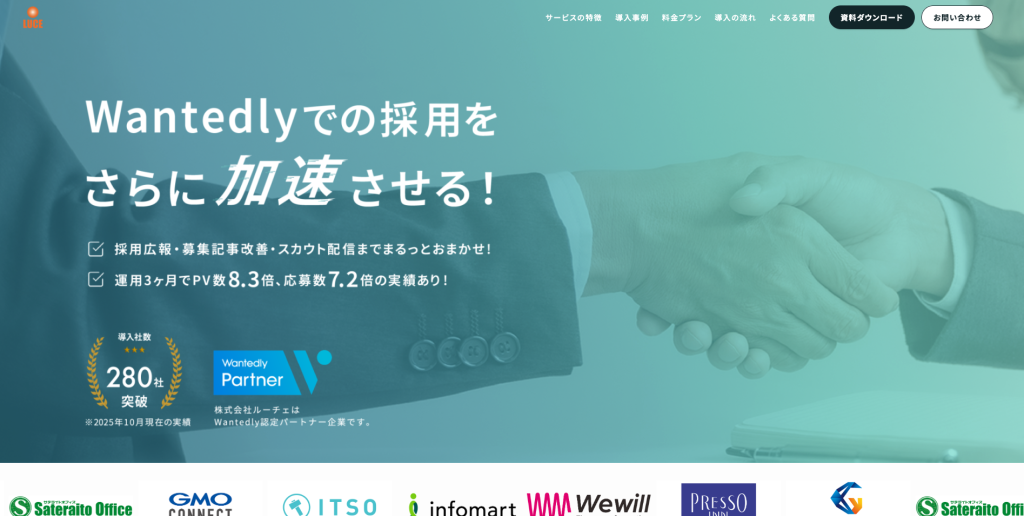 | 株式会社ルーチェ | 認定パートナー。280社支援。ペルソナ設計・求人最適化・AI×人のハイブリッド運用で応募数7倍・PV8倍など成果多数。 | 運用改善で成果を最大化したい企業/ブランディング強化も必要な企業 |
