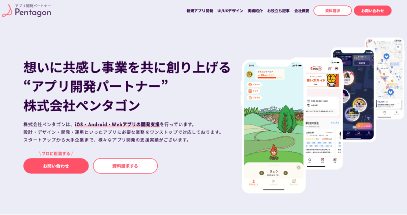 株式会社Pentagonは、デザインファーストを掲げるアプリ開発会社で、企画・要件定義からUI/UX設計、開発、運用保守まで支援します。