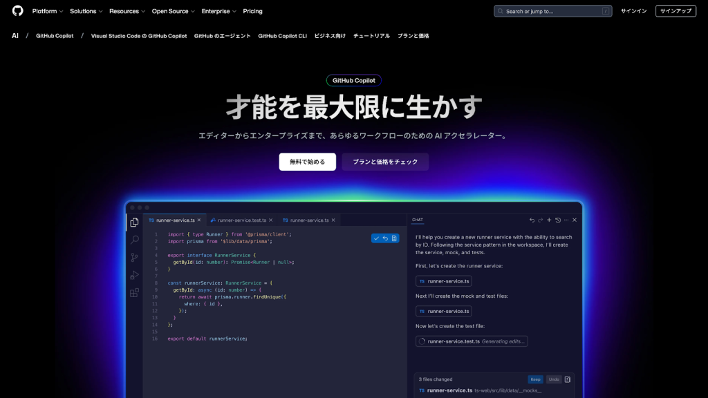 コードの生成や修正、リファクタリング、既存コードの解説などを自然言語で依頼でき、思考を止めずに開発を続けられます。