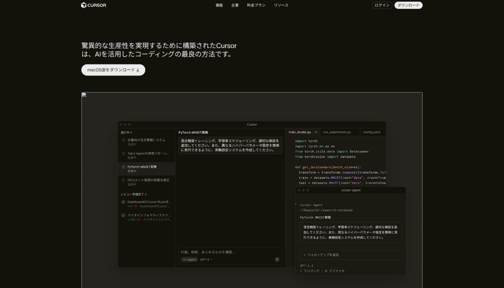 Cursorは、生成AIを標準搭載した次世代のコードエディタです。