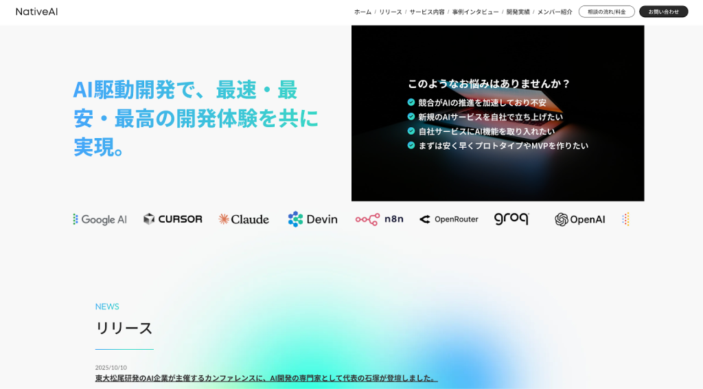株式会社NativeAIは、AI技術を中核に据えたプロダクト開発・システム開発を行うテクノロジーカンパニーです。