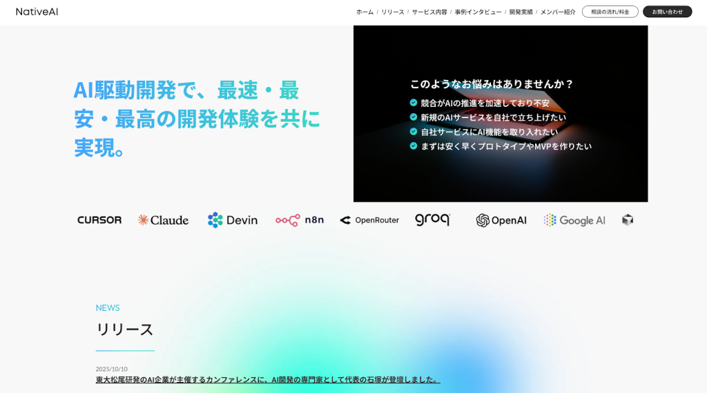 株式会社NativeAIは、AI駆動によるWebアプリやシステム開発を強みとする企業です。