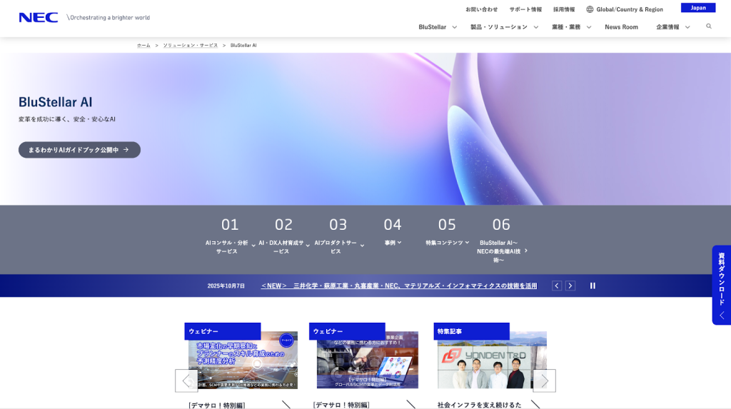 データ収集・分析や生成AIのリスキリング研修にも対応しており、技術導入だけでなく、社内でAIを活用できる体制づくりまで支援できる点が特徴です。