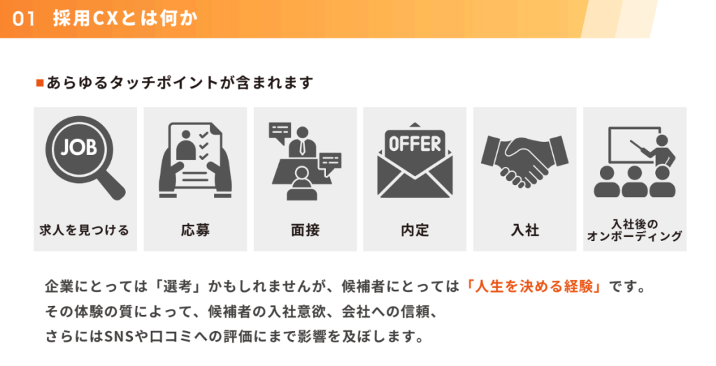 ここで重要なのは、採用CXには「あらゆるタッチポイント」が含まれるという点です 。