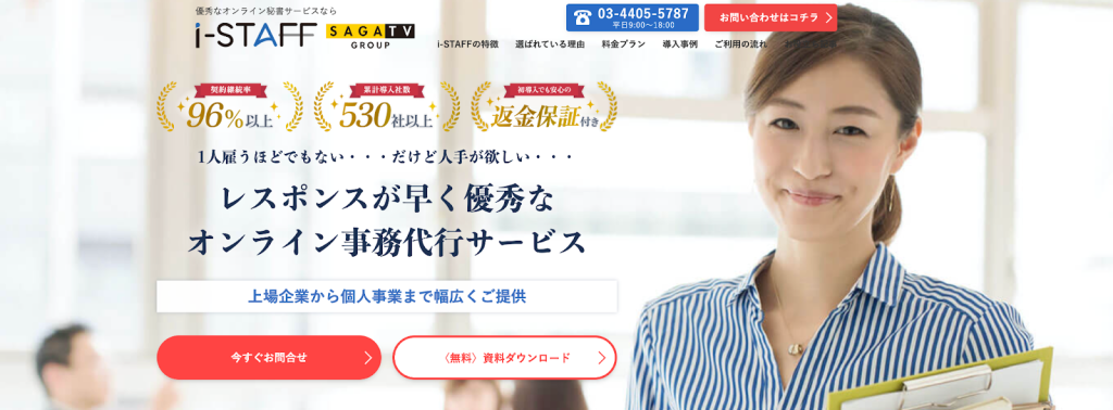 i-STAFFは、上場企業から個人事業主まで幅広く支援実績を持つオンラインアシスタント型の代行サービスです。記帳代行や請求書作成、振込・支払業務などの経理実務に対応し、スピードと正確性を両立した運用体制を整えています。