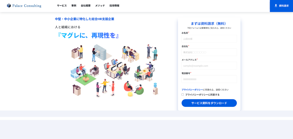株式会社Palace Consultingは、中小企業・地方企業・労働集約型ビジネスに特化した採用・組織コンサルティング支援を行う企業です。