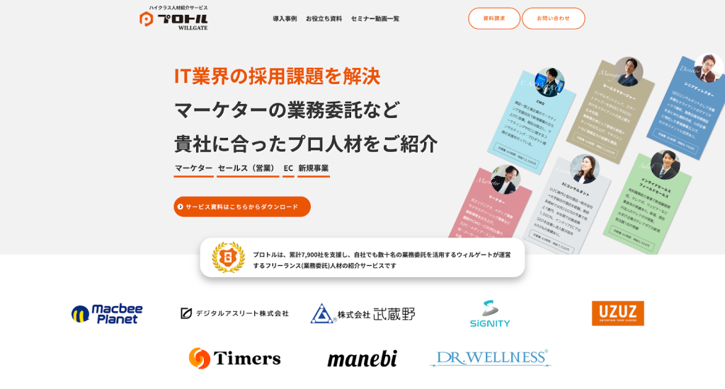 | 株式会社ウィルゲート | 企業の課題に合ったプロの業務委託人材を紹介 | 20万円/〜月 |