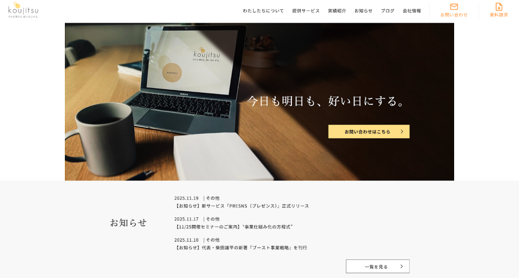 株式会社koujitsuは、Webサイトの戦略立案・デザイン・開発・運用までを一貫して提供する制作会社です。