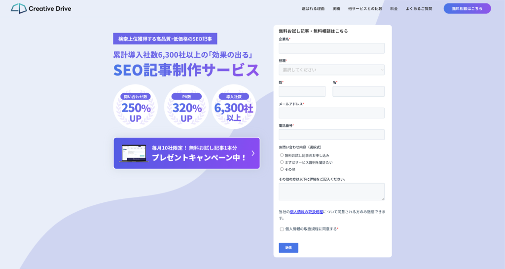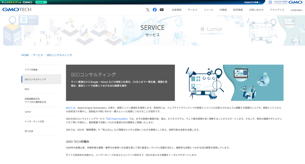 SEOサービスについては、コンサルティング、記事制作、内部改善、外部施策、CVR改善などを包括的に提供しています。