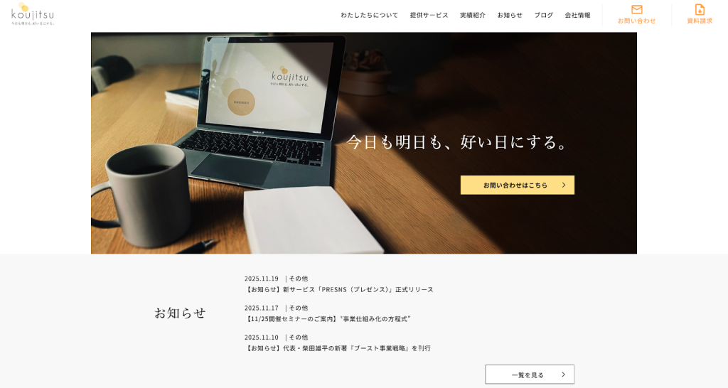 株式会社koujitsuは、マーケティング支援から制作・開発、広告運用、D2C事業、外食事業まで幅広く展開する総合デジタル支援企業です。