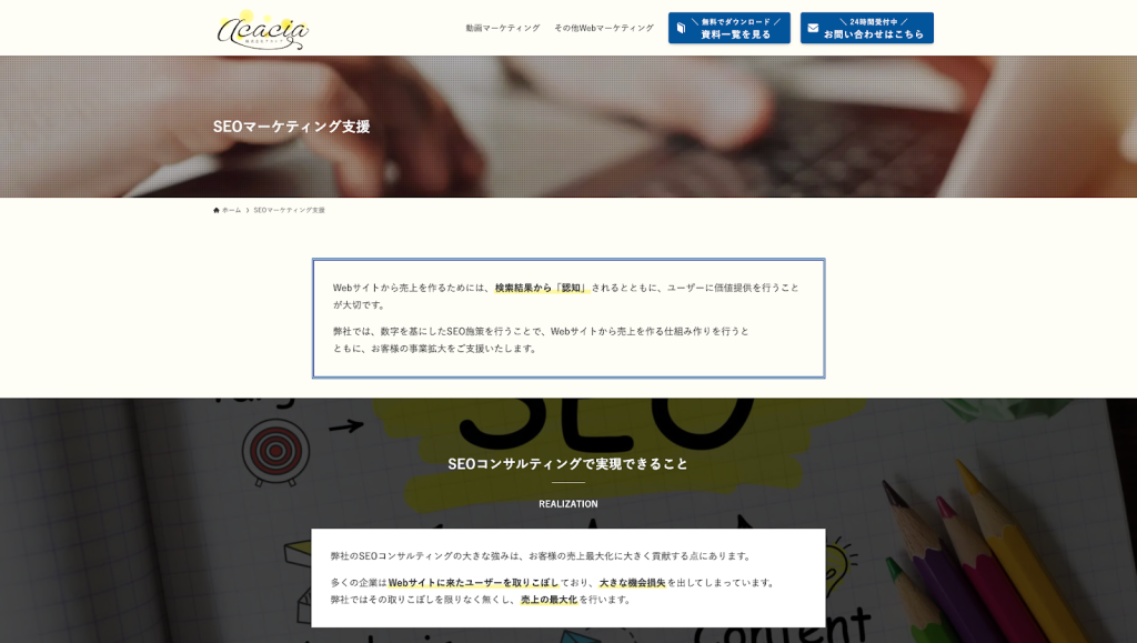 株式会社アカシアは、SEOマーケティング支援を中心に、YouTubeコンサルティングや動画制作、ホームページ制作など幅広いデジタル支援を展開しています。