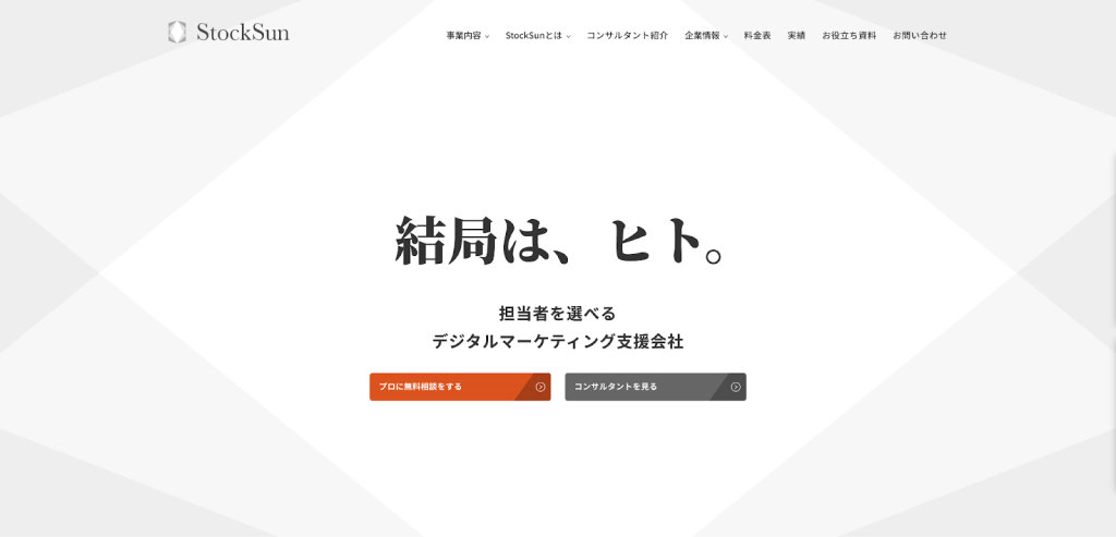 StockSun株式会社は、プロフェッショナルなフリーランス集団によるコンサルティングと実行支援を提供する企業です。