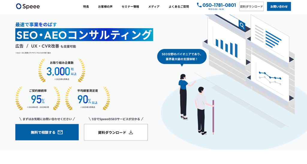 支援実績も3,000社以上と非常に豊富。幅広い業界・サイトタイプに対応してきた実績から、複雑なSEO課題にも柔軟にアプローチできる点が特徴です。